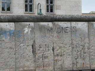 Estéticamente es sencillo rastrear la división de la ciudad. No es que hagan gran apología de ello. De hecho, no quedan demasiados restos del muro en pie –aunque sí suficientes-, y la línea que dibuja en el suelo por donde pasó la pared de 1961 a 1989 es cuando menos discreta. Hay en el centro tres memoriales importantes al muro en sí, en Bernauerstrasse, con el Museo del Muro, en Niederkirchnerstrasse, donde se aprovecha para la exposición al aire libre de la Topographie des Terrors (que es en alemán y que sólo tiene publicidad de audioguías en otro idioma: ¡castellano!), y en Friedrischhain, el llamado East Side Gallery, ahora simple galería de exposición de graffitis. Desde la torre de la televisión se aprecia muy bien el barrio estalinista construido en los cincuenta, con las viviendas prefabricadas, que se desperdiga alrededor de Alexanderplatz hacia la Karl Marx Alle (que en su día fuera la Stalinalle).